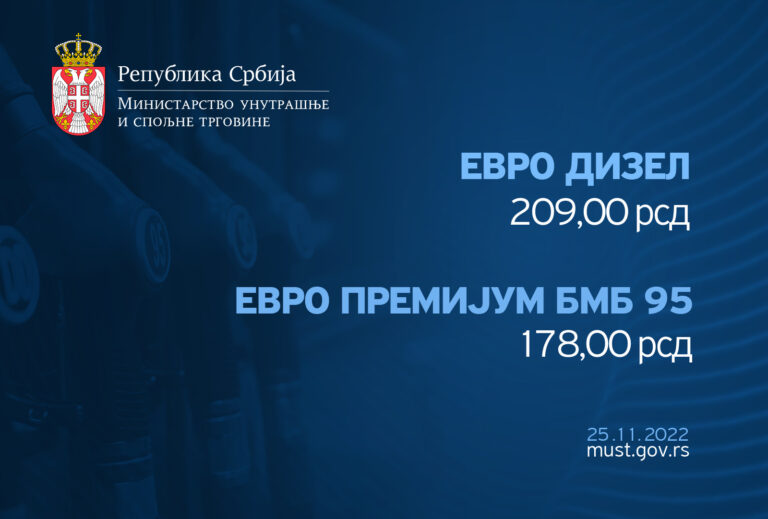 Ministarstvo trgovine, turizma i telekomunikacija objavilo je nove najviše maloprodajne cene derivata nafte za period od 15 časova 15. novembra 2022. godine do 02. decembra 2022. godine, i to za: EVRO DIZEL u iznosu 209 dinara za jedan litar i EVRO…
