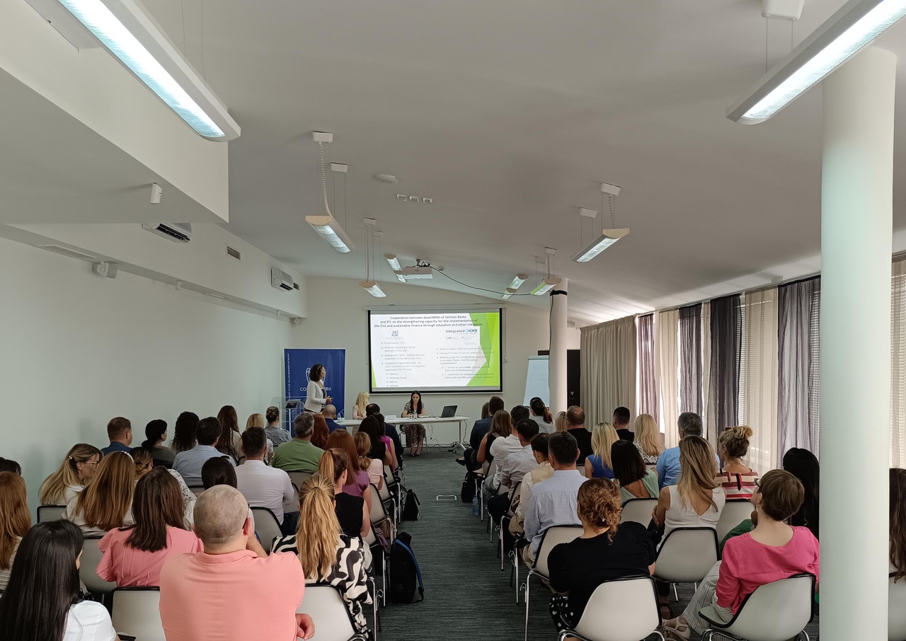 Slađana Sredojević, Sekretar Odbora za razvoj finansijskih tržišta i Odbora za edukaciju i ljudske resurse, i Slavica Drinić, Specijalista za upravljanje rizicima i kontrolu poslovanja banaka i poslovanje banaka sa pravnim licima u zemlji, ispred Udruženja banaka Srbije predstavile su upitnik koji će u narednom periodu sva pravna lica morati da popune zajedno sa svojom poslovnom bankom i koji će služiti za merenje doprinosa preduzeća u postizanju i implementaciji ESG standarda.
