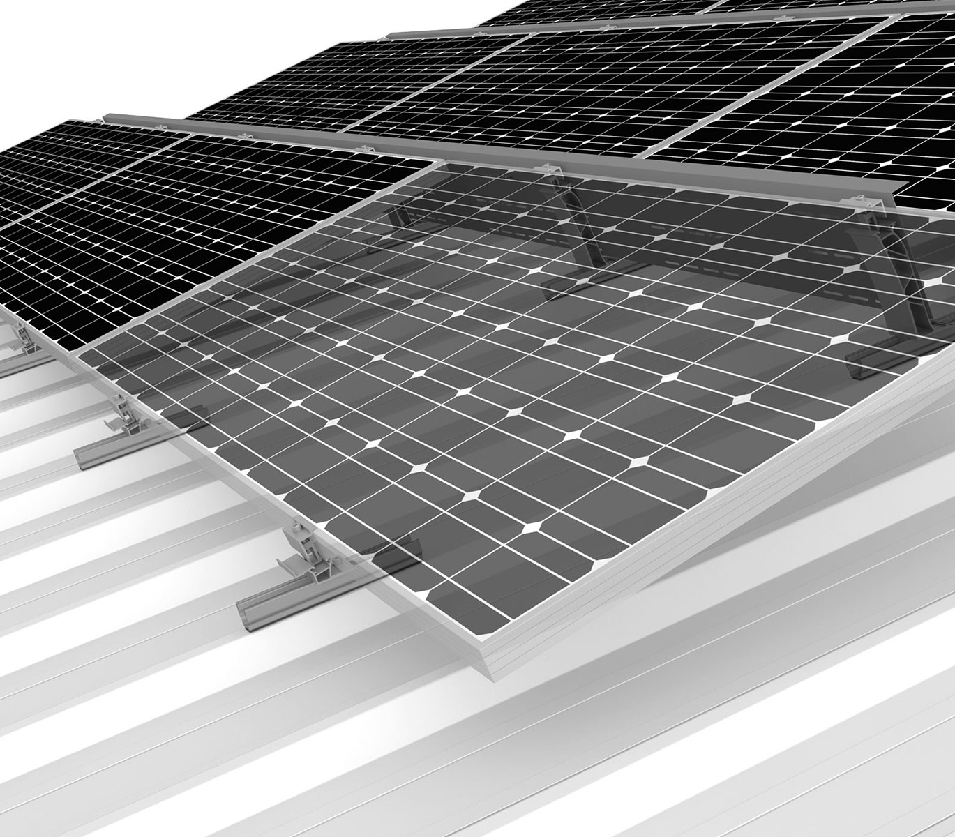 Dodatno podizanje na krovovima od trapezoidnog lima omogućava bolji ugao sunčevih zraka i time optimizovan energetski prinos – posebno kod blagih nagiba krova između 0° i 10°. U zavisnosti od tipa krova i željene orijentacije modula, dve proverene sistemske kombinacije – zasnovane na kratkim ili dugim šinama – omogućavaju preciznu i energetski efikasnu montažu PV modula.