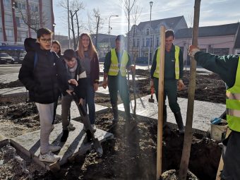 Mladi članovi Biblioteke šabačke posadili su juče drveće na Vinaverovom trgu gde se radovi privode kraju. Popločavanje platoa trga je završeno, montiraju se instalacije na zgradi Zorkinog solitera, a u narednom periodu biće postavljen mobilijar.